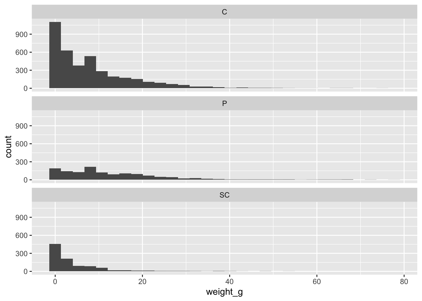Let’s visualize the spread of weight among each group, looking at group summaries with a geom_boxplot() and group weight distributions with geom_histogram() and facet_wrap()
