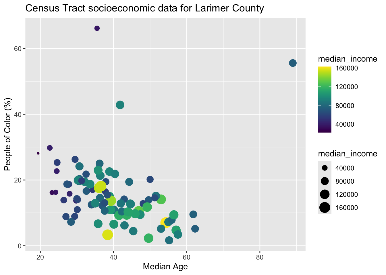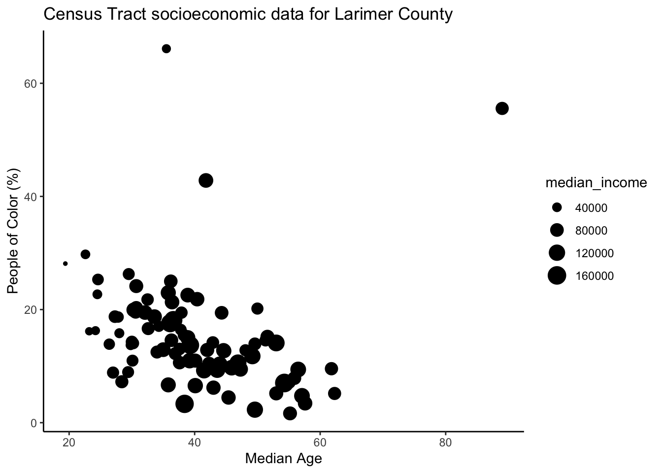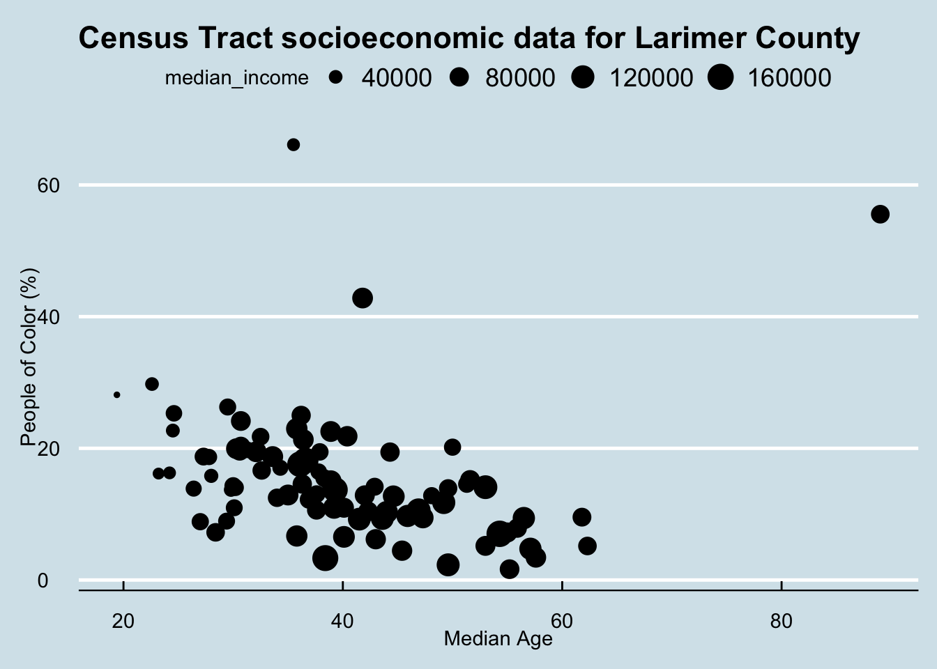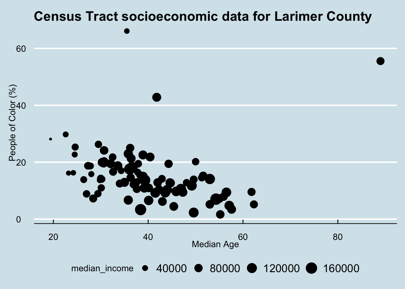 Note: This census data for Larimer county was retrieved entirely in R using the tidycensus package. If you are interested in how I did this, I’ve uploaded the script to do so on Canvas titled ‘getCensusData.R’. Note that you will need to retrieve your own census API key and paste it at the top of the script to run it (API keys are free and easy to get here). To learn more about tidycensus, check out Analyzing U.S. Census Data by Kyle Walker.