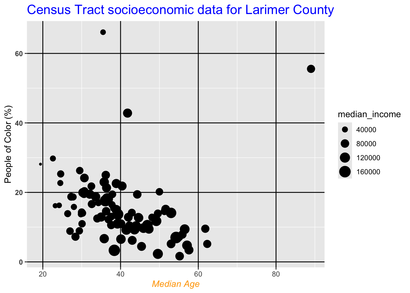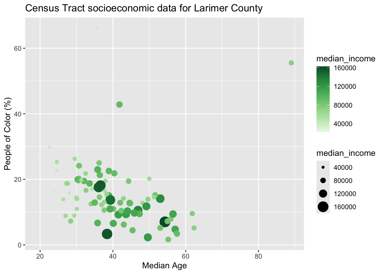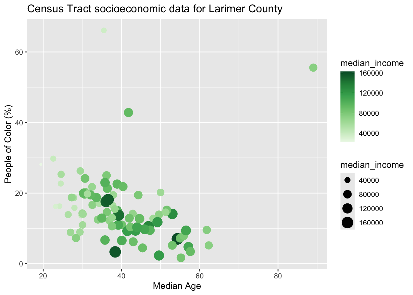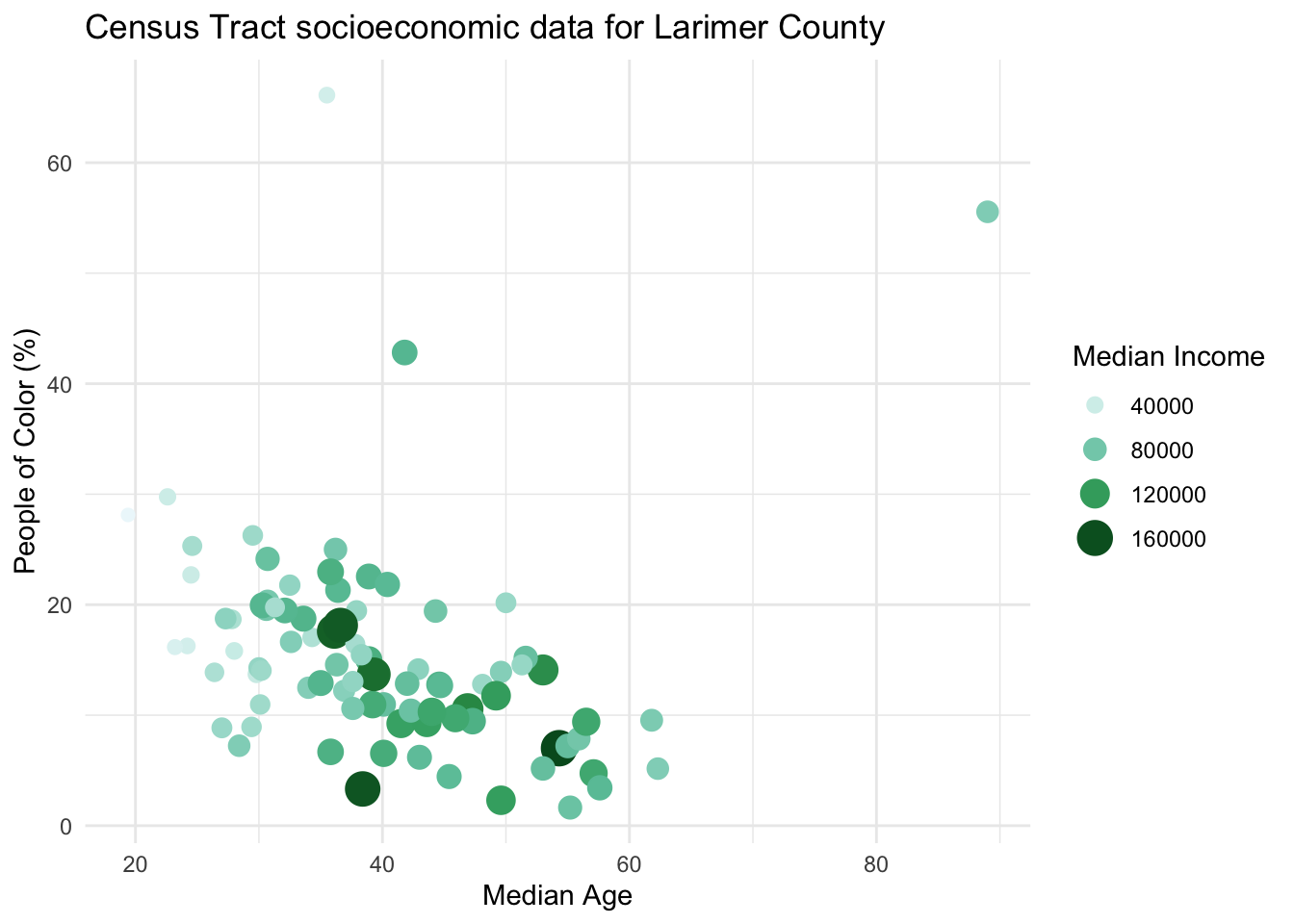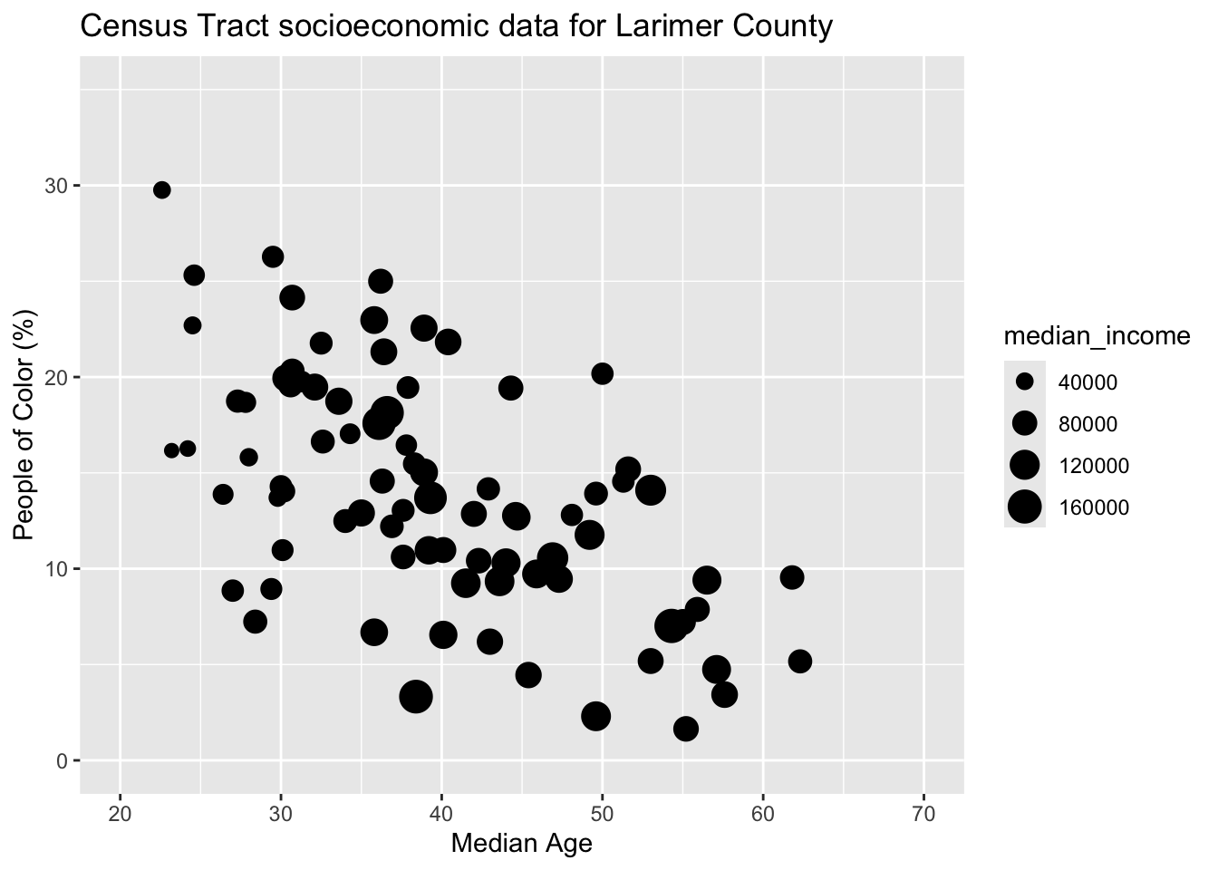 Note: This census data for Larimer county was retrieved entirely in R using the tidycensus package. If you are interested in how I did this, I’ve uploaded the script to do so on Canvas titled ‘getCensusData.R’. Note that you will need to retrieve your own census API key and paste it at the top of the script to run it (API keys are free and easy to get here). To learn more about tidycensus, check out Analyzing U.S. Census Data by Kyle Walker.