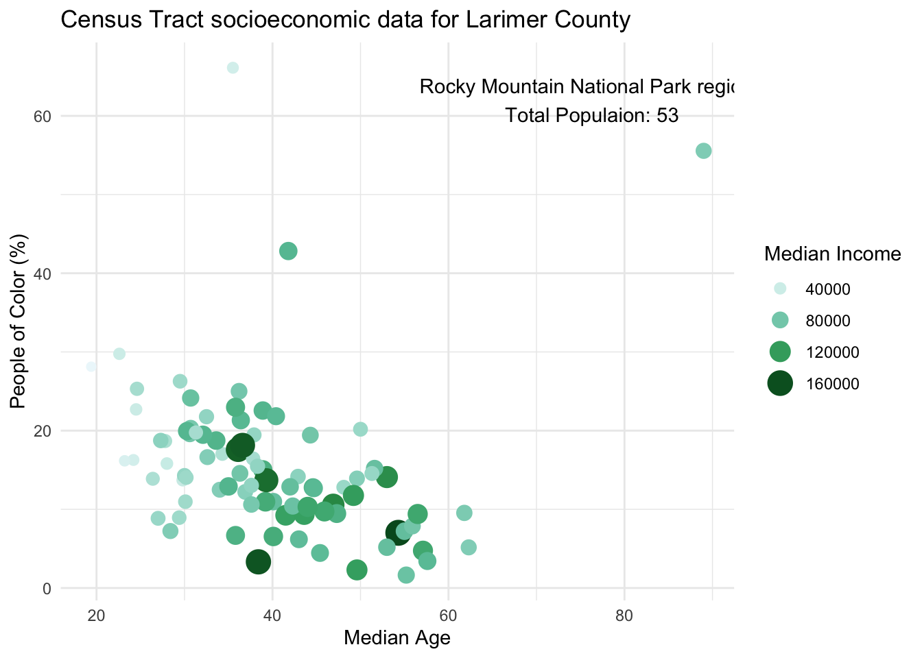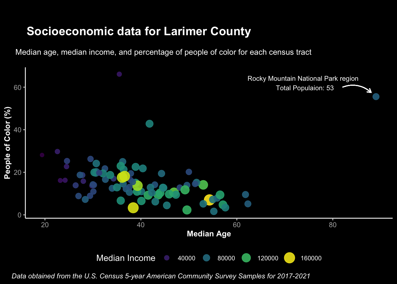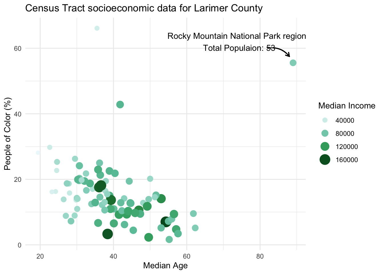 When investigating the outlying point with the highest median age and high percentage of people of color, it turns out that census tract includes Rocky Mountain National Park and the surrounding area, and also the total population of that tract is only 53. Lets add these details to our chart with annotate(). This function requires several arguments: