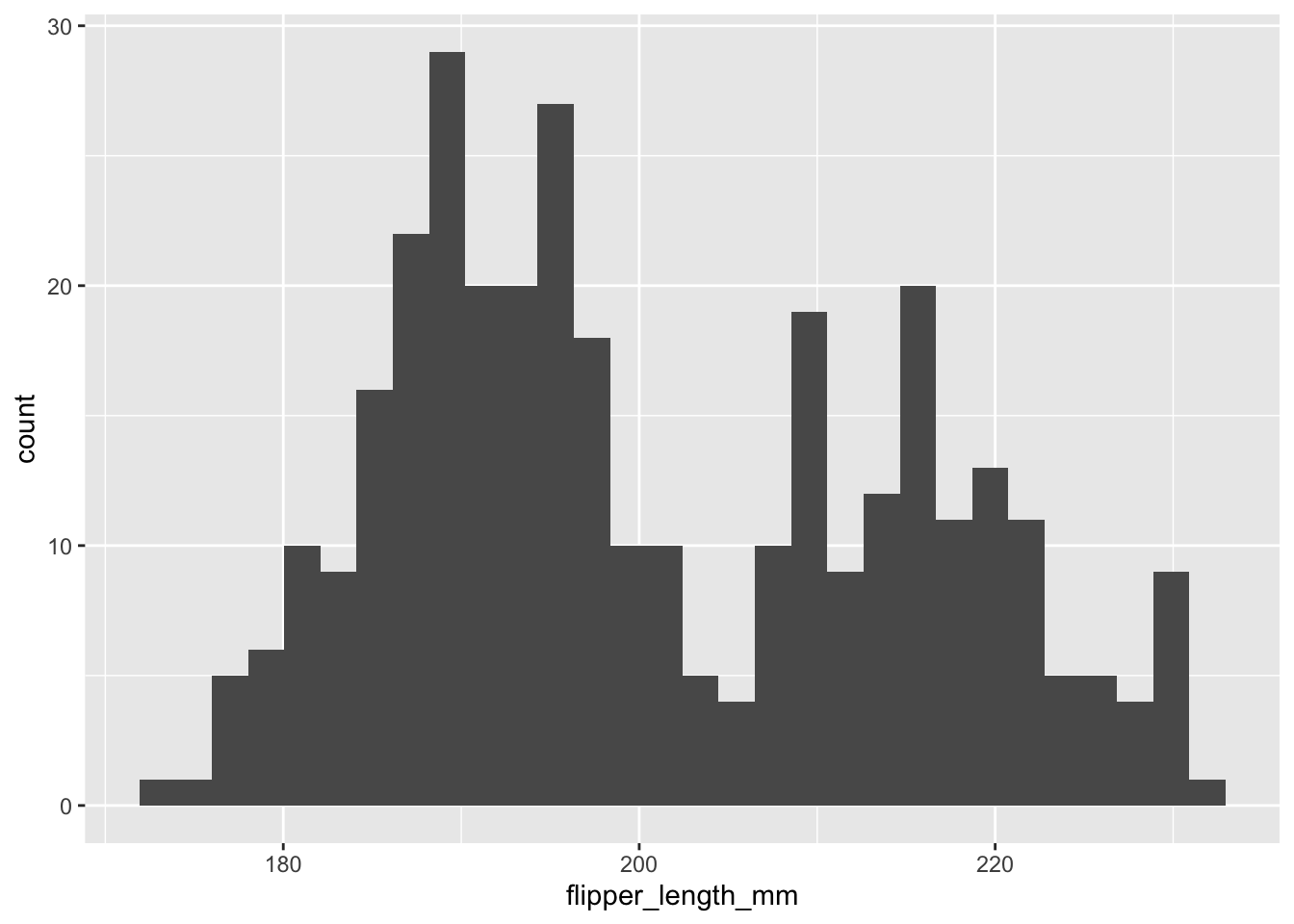 geom_histogram(mapping = aes(x = flipper_length_mm))