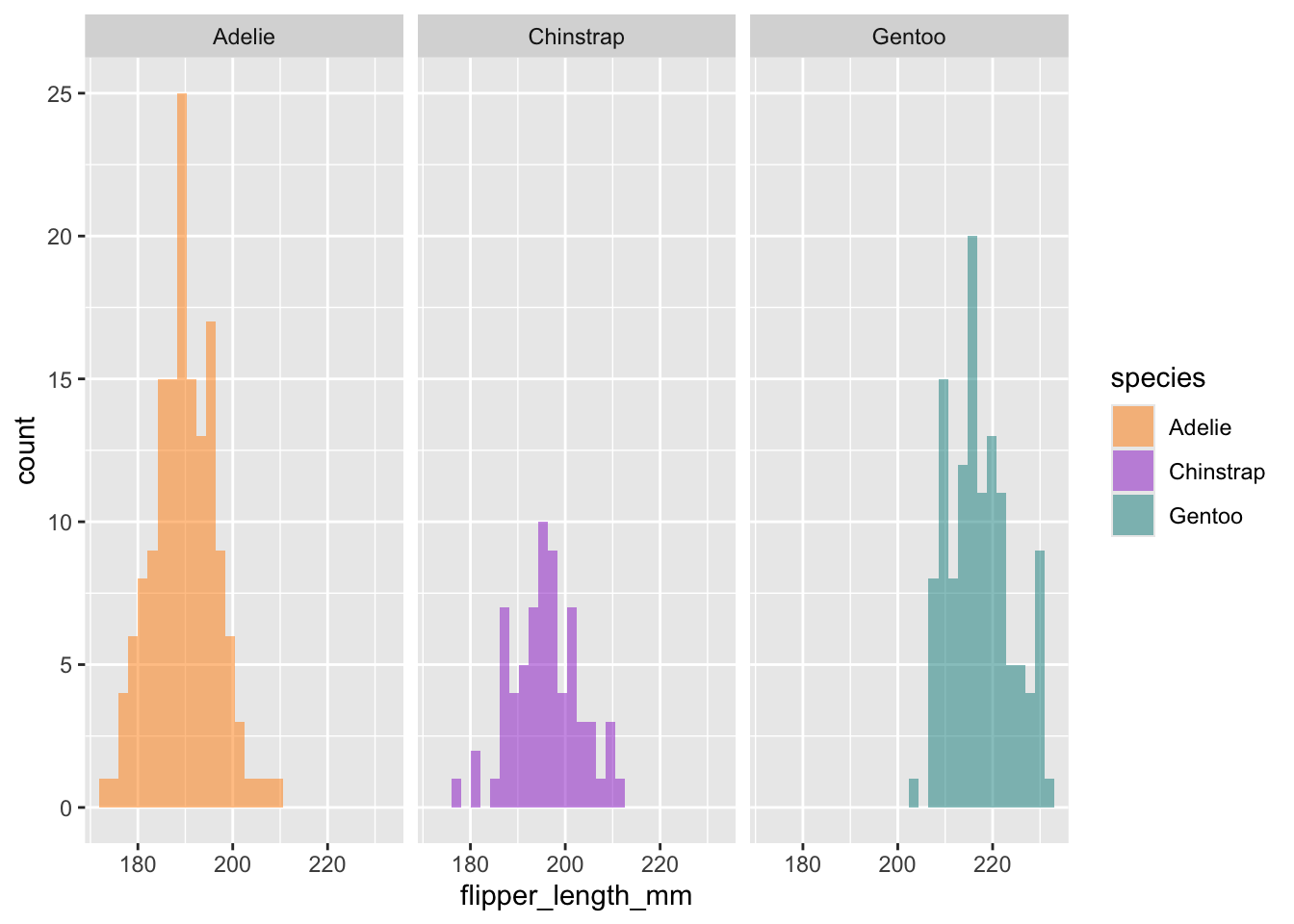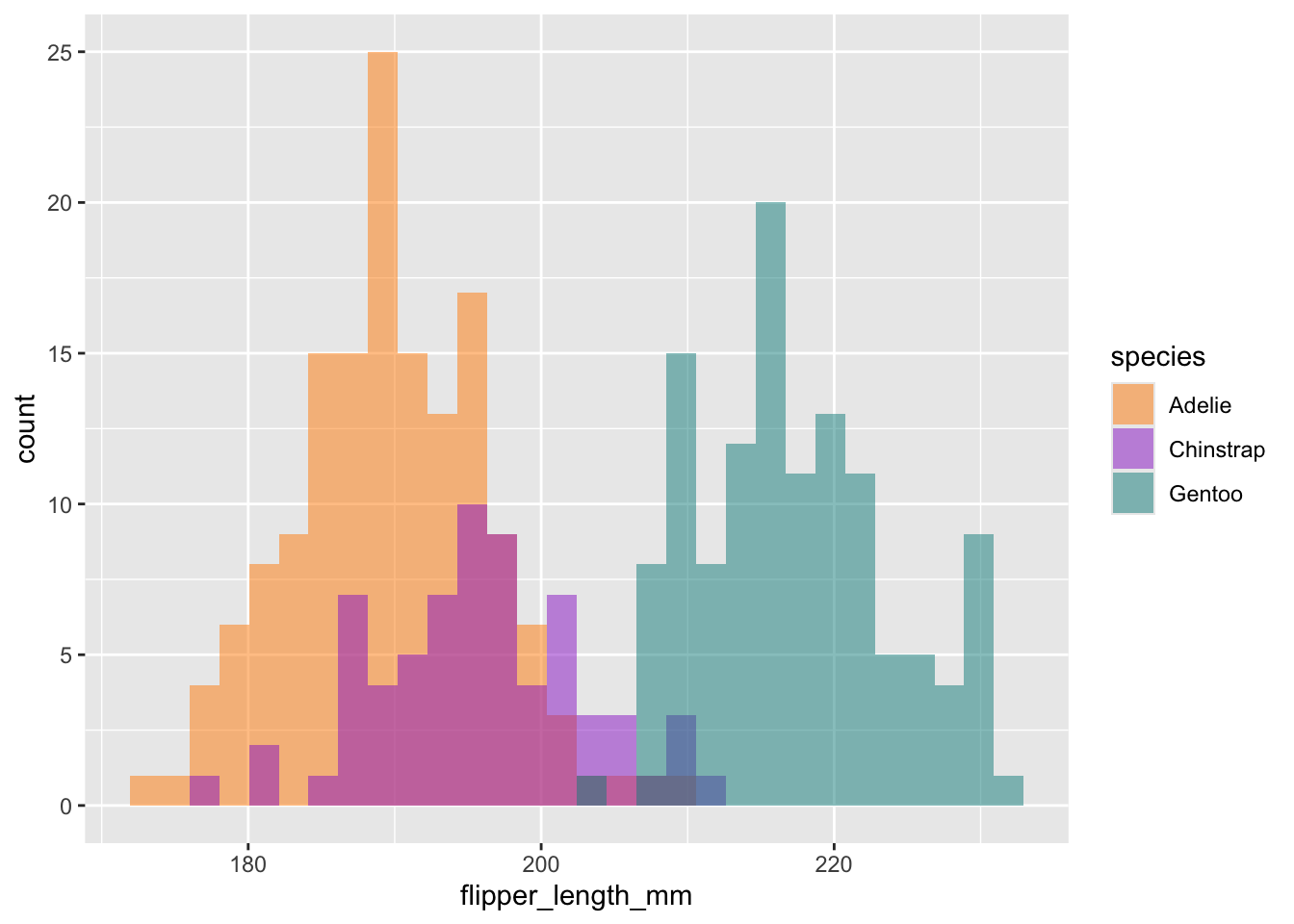 # Histogram example: flipper length by species