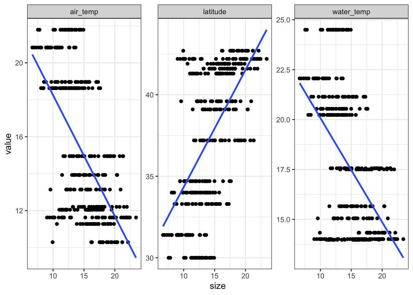 Here we are using the pie_crab data set again to develop a multiple linear regression model to predict crab size with additional variables from the data set, latitude, air_temp, and water_temp. Let’s first plot each of our predictor variables’ linear relationship with our response variable, crab size:
